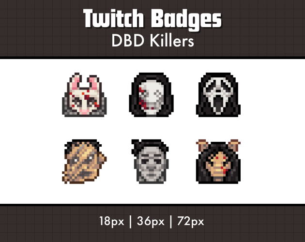 Twitch streamer sub badges, DBD killer themed! This pack contains 6 badges each in 3 sizes: 18x, 36px, and 72px.